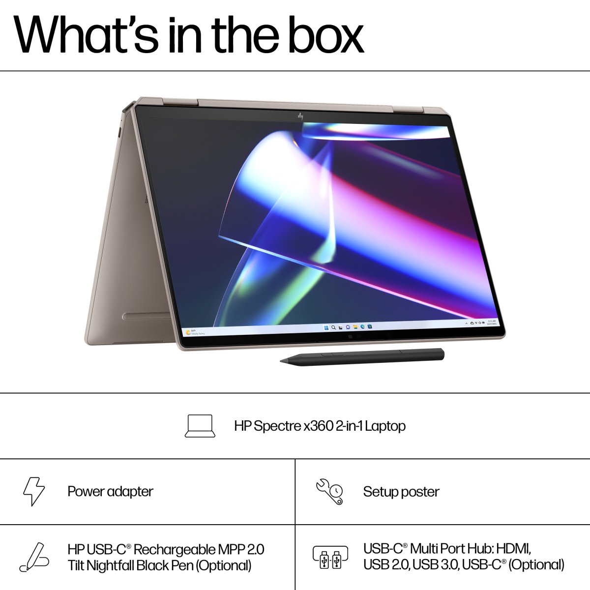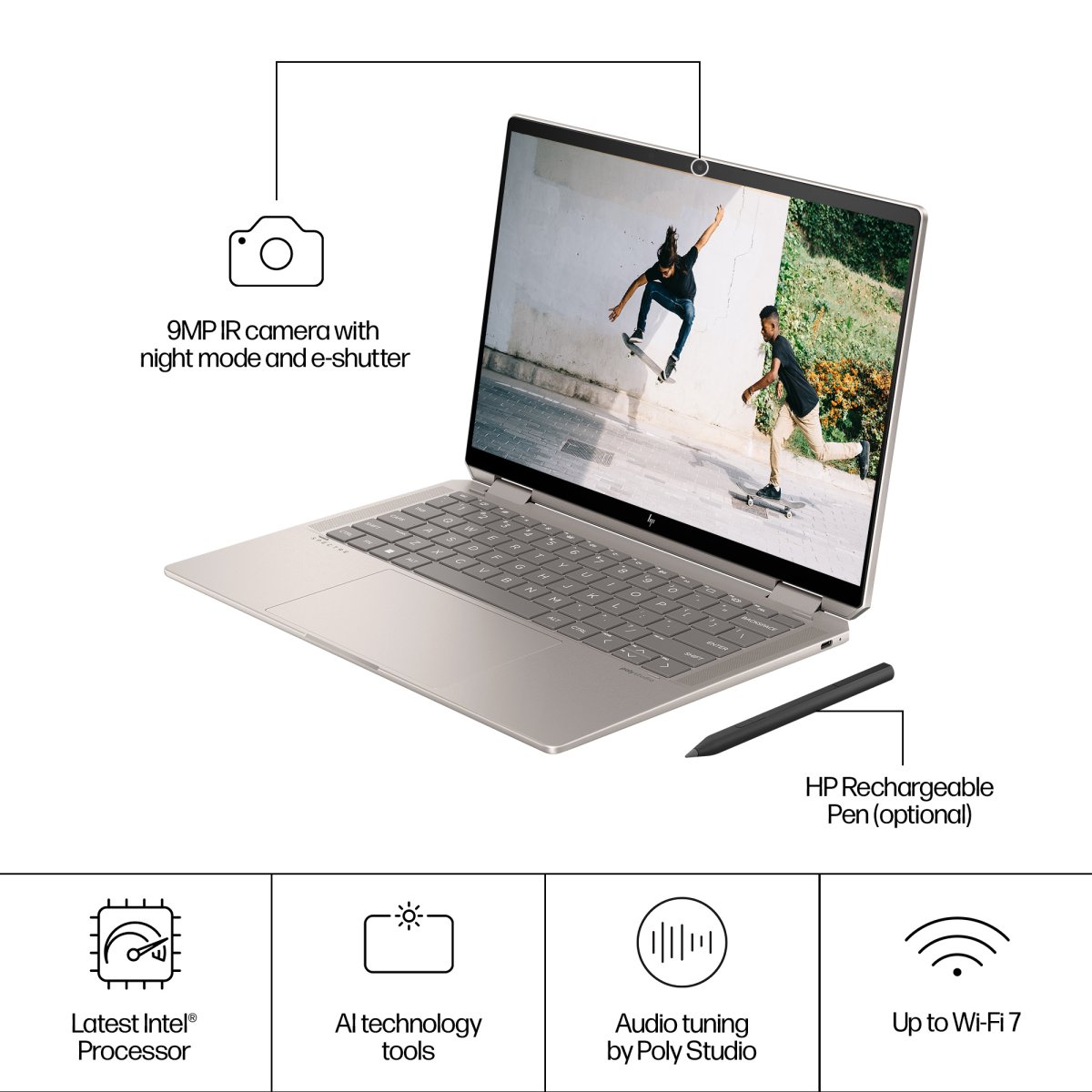 Elevate your productivity with the HP Spectre x360 14″ 2-in-1 Laptop PC. Easily switch between laptop and tablet, and experience the power of built-in AI technology with the latest Intel Processor[1] and advanced collaboration technology that adapts to your way of working—all in a responsibly made laptop.