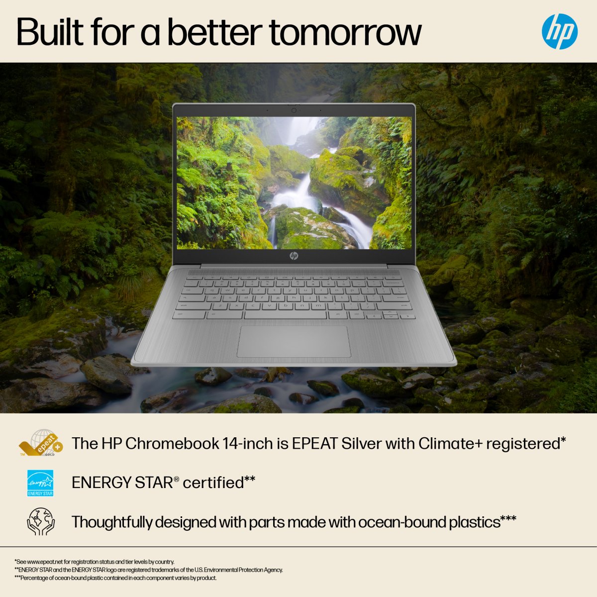 Stay productive and entertained with the HP Chromebook 14”. Powered by an Intel Processor[1] and ample storage, it’s perfect for work and fun, with built-in Google apps and other popular apps[3]. Enjoy HD[4] video calls, streaming, and gaming on the micro-edge display, plus worry-free performance with automatic updates and built-in security.