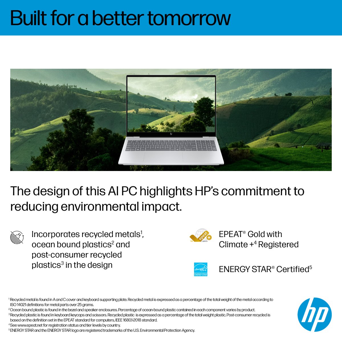 HP OmniBook 7 16 AI PCs are designed using recycled metals[3] and post-consumer recycled plastics[4].
