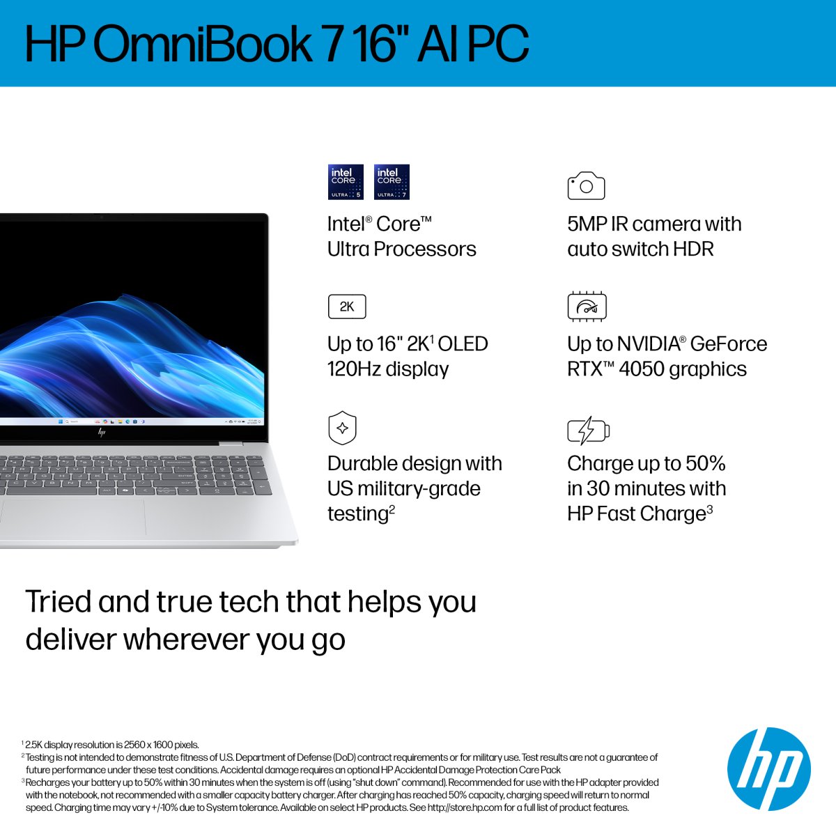 Tough enough to meet demanding US military-grade standard testing[1], HP OmniBook 7 16 AI PC delivers durability, performance, and portability, powered by the latest AI-enhanced Intel Core™ Ultra Processor[2] and a brilliant 16” display[5].