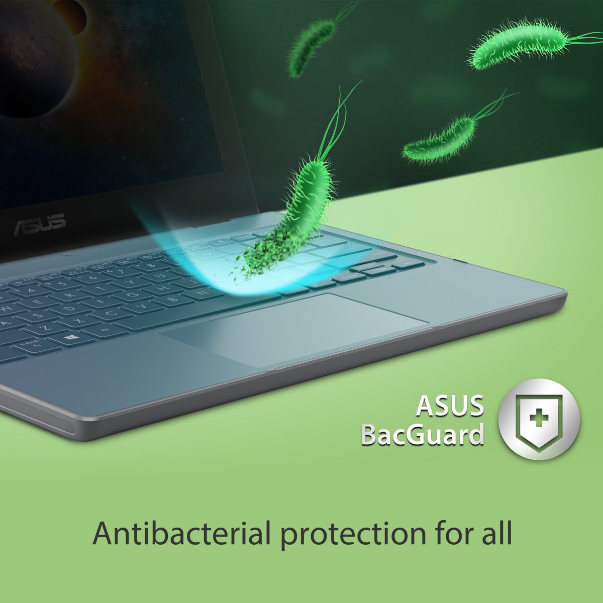 The surface of any laptop harbors thousands of potentially harmful bacteria. To keep your ASUS BR1100C hygienic, the keyboard, touchpad, and palm rest are all protected with antibacterial treatment.5,6 This has been scientifically shown by the internationally-recognised ISO 22196 standard to inhibit the growth of bacteria by in excess of 99% over a 24-hour period. ASUS Antibacterial Guard is also made to withstand alcohol-based cleaning products and hypochlorous acid water7, empowering you to keep the surface of your laptop clean and sanitary – limiting the spread of harmful bacteria.