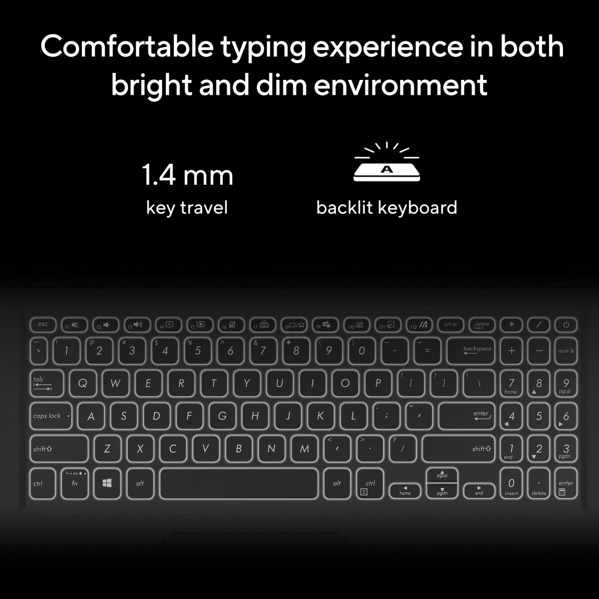 The full-size backlit keyboard3 on Vivobook 15 is perfect for working in dim environments. Ergonomically designed, its sturdy, one-piece construction and 1.4 mm key travel provide a comfortable typing experience.