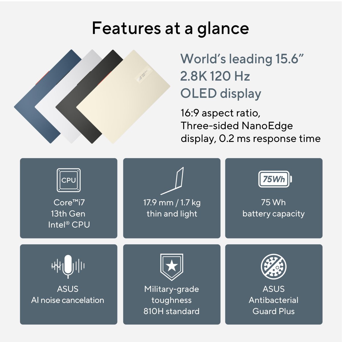 Unleash the possibilities with Vivobook S 15 OLED, the outstanding laptop for school, work or entertainment. With the awesome power of its 13th Gen Intel® Core™ i9 H-series processor and a high-capacity 1 TB SSD, any task is easy — work or play, anywhere, anytime. And everything will look its best on the world-leading 15.6-inch Full HD 60 Hz OLED display! The super-stylish new design with its brilliant colors shouts your personality to the world. Explore further and faster with Vivobook S 15 OLED!
