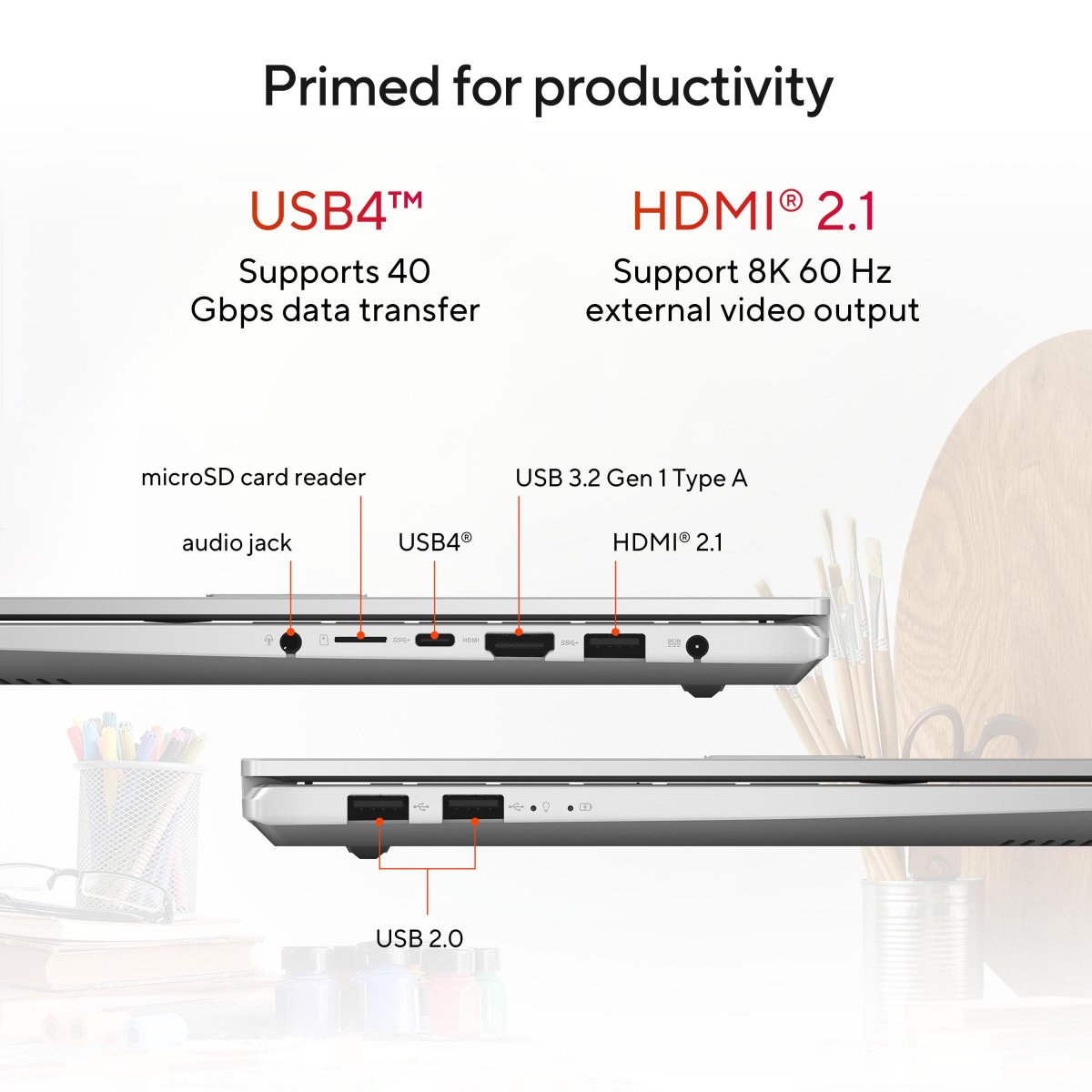 Vivobook Pro 15 features a productivity-enhancing array of I/O ports, including an ultrafast USB 4.0 Gen 3 Type-C® port that supports fast data transfers, a microSD card reader, and an advanced HDMI® 2.1 port, which supports up to an 4K external monitor, as well as USB 3.2 Gen 1 Type-A and USB 2.0 ports — so you can easily connect all your latest peripherals, displays, or projectors to help you import, export, share or display your content faster and more conveniently than ever.