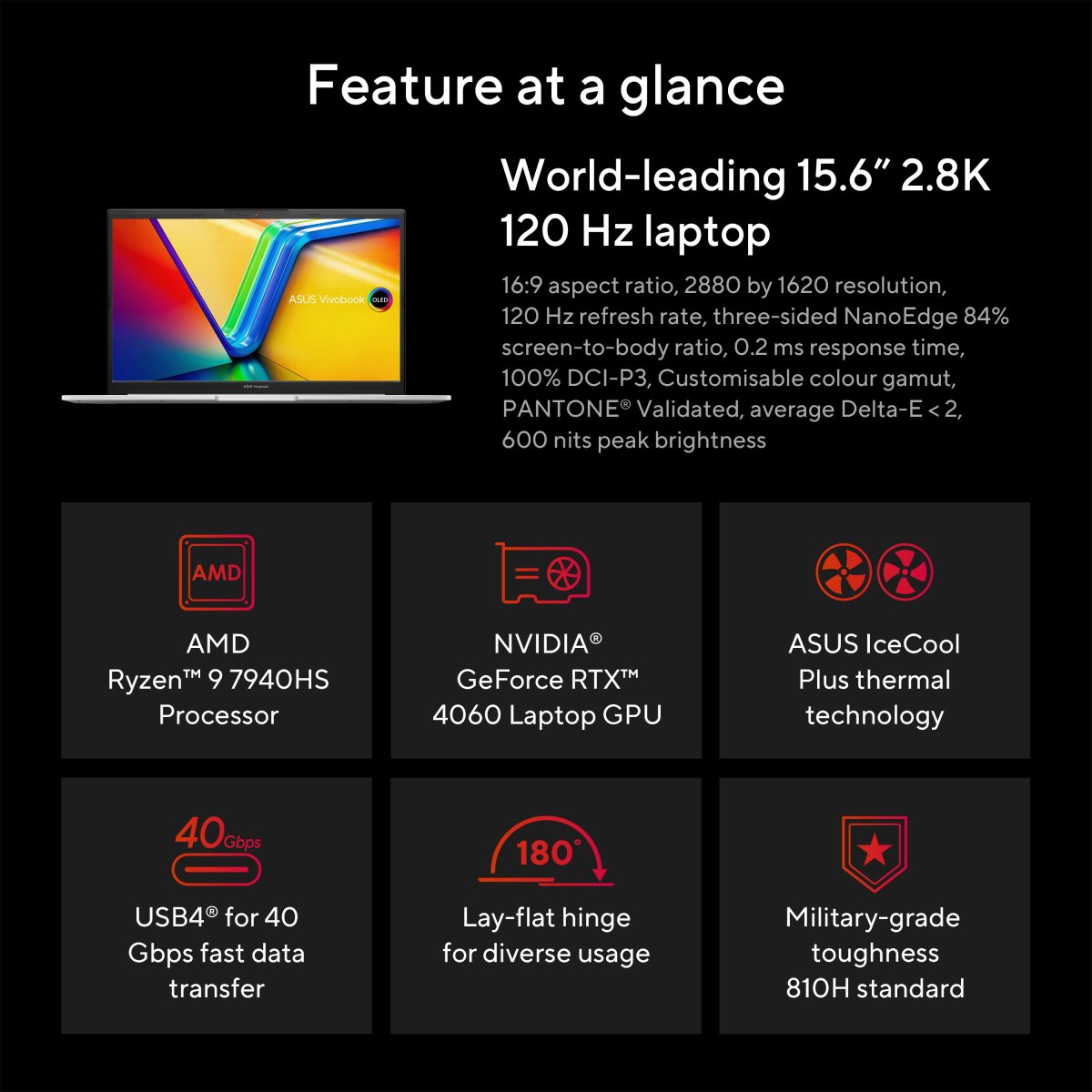 Vivobook Pro 15 gives you all the graphics power you need for your creative projects. NVIDIA® GeForce RTX™ 4060 Laptop GPU, based on the latest NVIDIA® Ampere architecture, gives you the best visual experience.