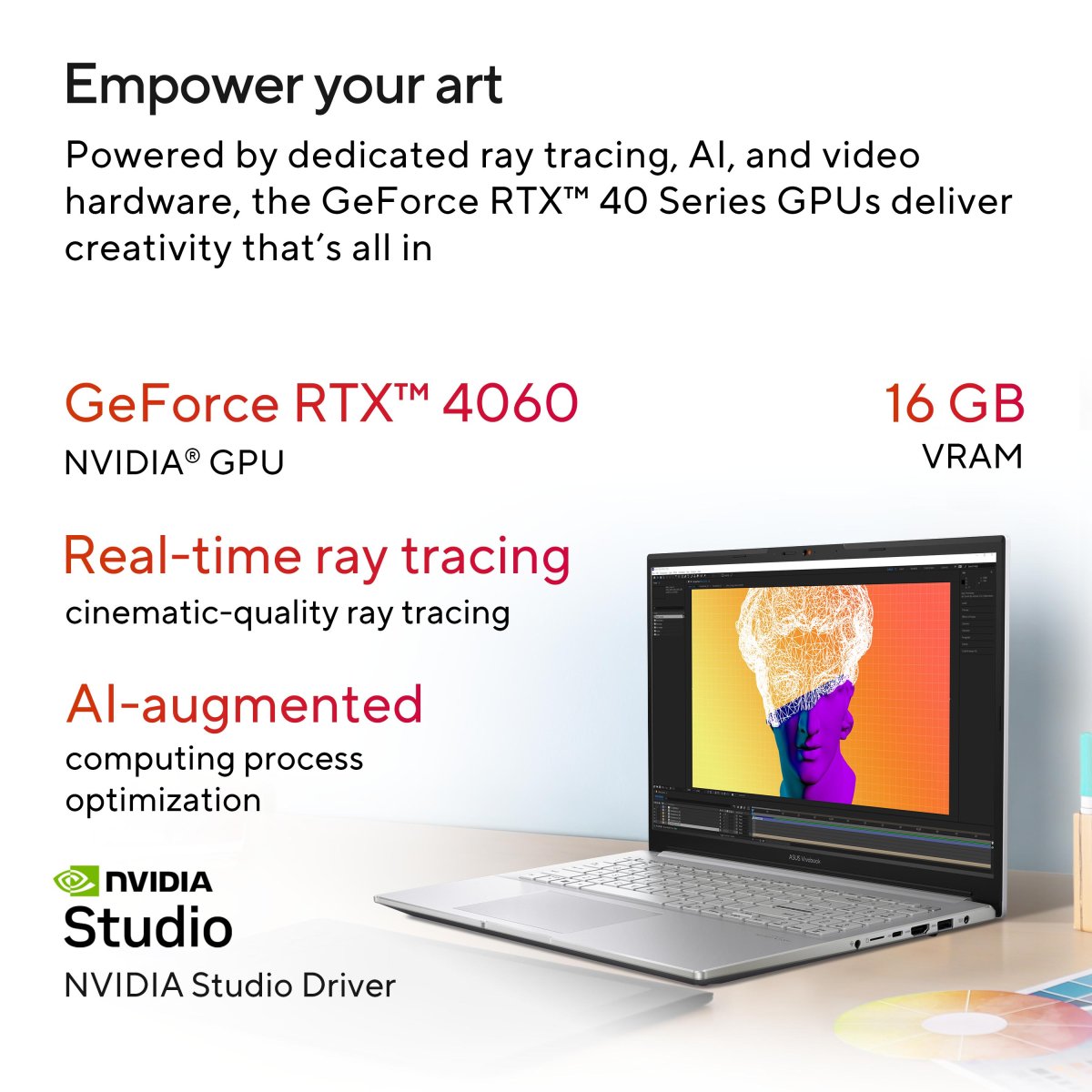 Take your creative projects to the next level with NVIDIA Studio. Get unmatched laptop performance in 3D rendering, video editing, live streaming, and graphic design. Experience RTX accelerations in top creative apps, world-class NVIDIA Studio drivers, and the Studio suite of exclusive AI-powered software.