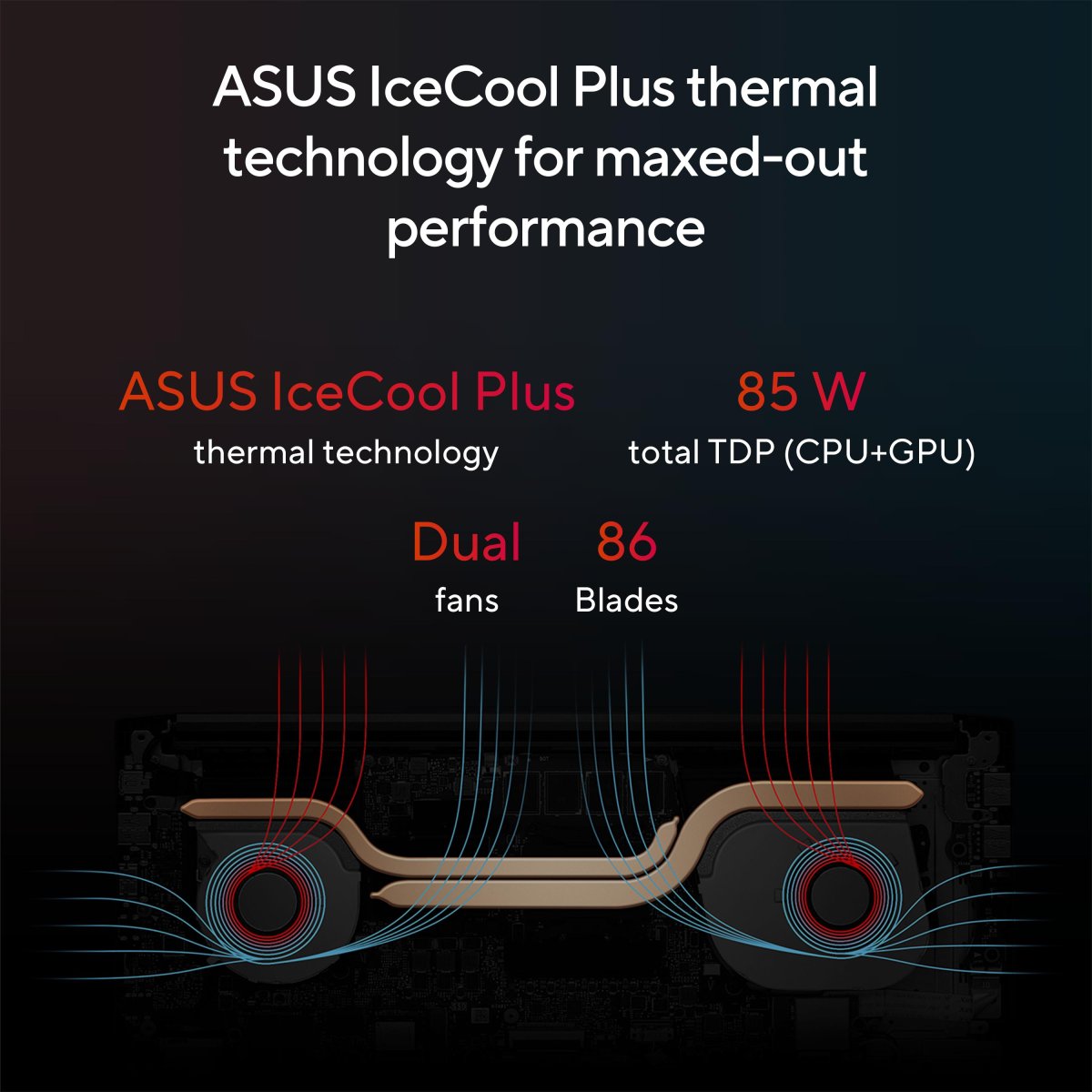 For always-cool performance, the ASUS IceCool Plus thermal technology in Vivobook Pro 15 uses upgraded 8 mm and 6 mm heat pipes with dual fans that efficiently accelerate heat transfer. The 86-blade fan and impeller are made of side-chain liquid crystal epoxy polymer (LCP): the quiet, power-efficient 3D-curved blade design increases airflow by up to 16%. With less vibration, the Intel Core CPU and NVIDIA GPU can run comfortably at up to a blistering 85 W combined TDP in Performance mode — with no throttling!