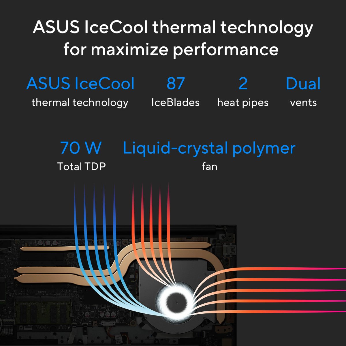 To keep your laptop cool in all situations, the ASUS IceCool thermal technology in Vivobook 16X uses upgraded 8 mm, 6 mm and 4 mm heat pipes*, and an IceBlade fan that efficiently accelerates heat transfer. The 87-blade fan and impeller are made of a liquid-crystal polymer that means they’re lighter and thinner than ordinary fans. In addition, the IceBlade fan also use a fluid-dynamics bearing that’s quieter and has less vibration than an ordinary bearing. The end result is that the Intel Core CPU and NVIDIA GPU can run comfortably at up to a blistering 70 W combined TDP 3 in Performance mode — with no throttling!