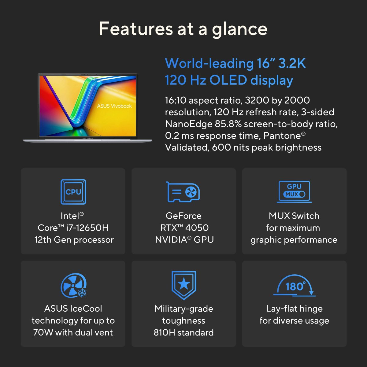 Vivobook 16X has the power to turn your ideas into creations faster than ever, thanks to its super-powerful Intel®Core™ i7-12650H Processor and NVIDIA® GeForce RTX™ 4050 Laptop GPU. These are supported by a 512 GB SSD, 16 GB DDR4 memory and ultrafast WiFi 6E — the perfect high-performance choices for this stylish powerhouse!