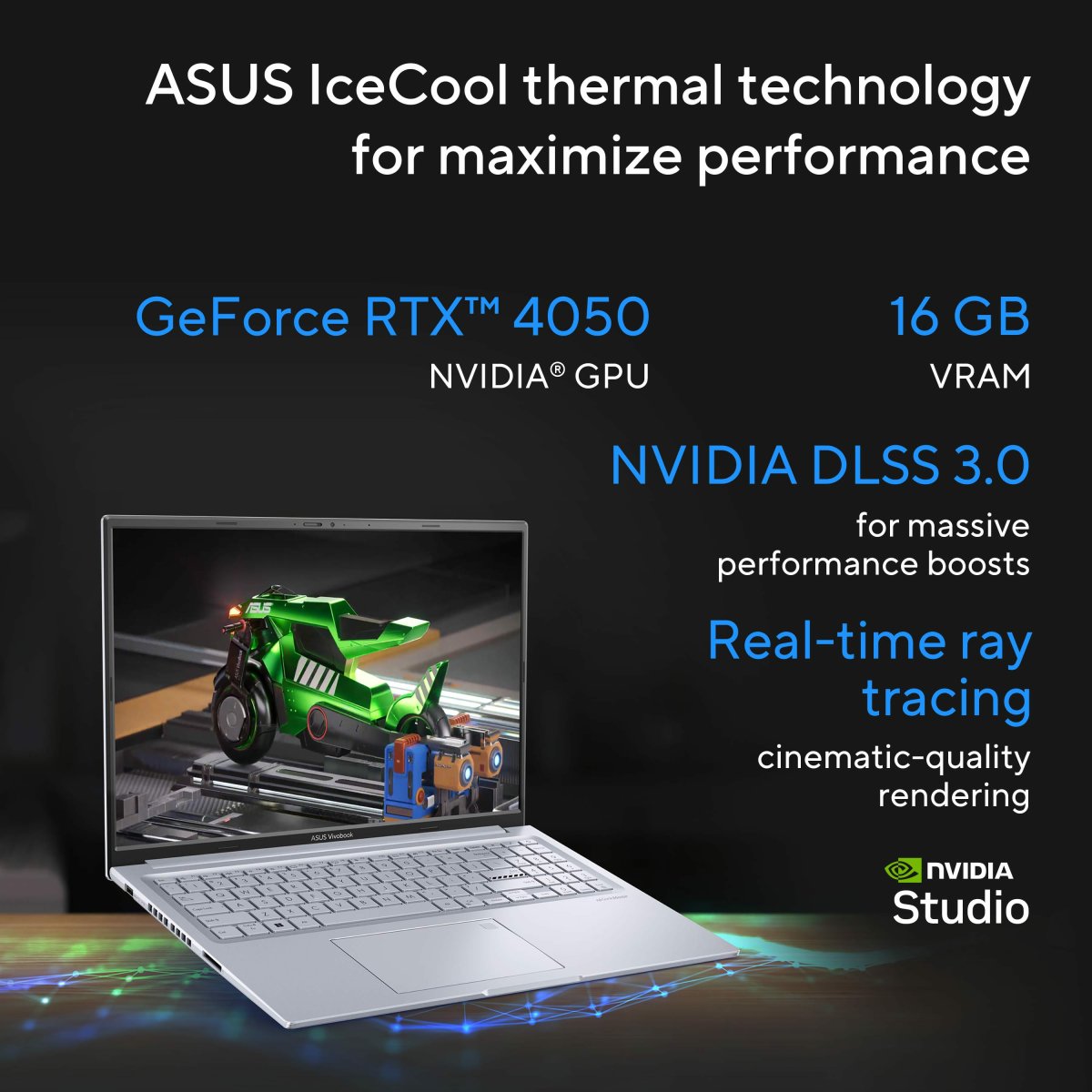 Vivobook 16X has everything a creator needs, including a top-notch NVIDIA GeForce RTX™ 4050 GPU that’s based on the latest NVIDIA Ada Lovelace architecture. Whether you’re just starting out on your creative journey, or need to tackle pro-level rendering or livestreaming, you’ll nail it thanks to the advanced GPU features like ray tracing, AI acceleration and speedy GDDR6 memory. And for maximum performance and stability, Vivobook 16X comes with the exclusive free NVIDIA Studio drivers1.