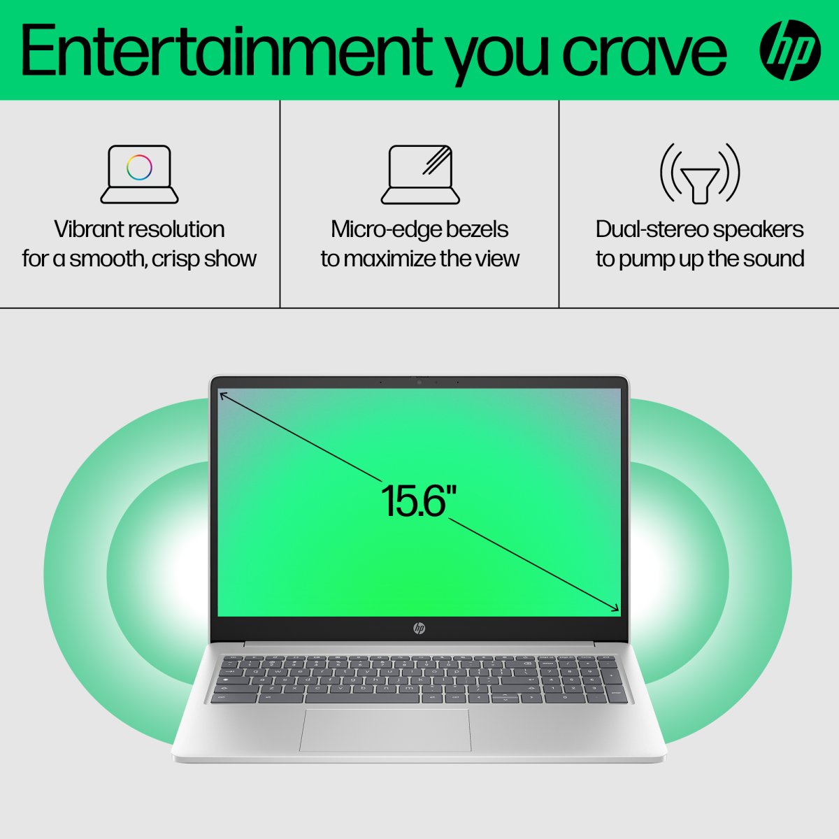 The sleek HP Chromebook Plus delivers prime power for productivity with a full-size keyboard and numpad, 15.6″ diagonal screen, fast memory, plus ample storage and up to 13 hours battery life[2]. Stay product with fast bootups, built-in virus protection, the latest Wi-Fi technology, and access to tons of apps in the Google Play Store[7].