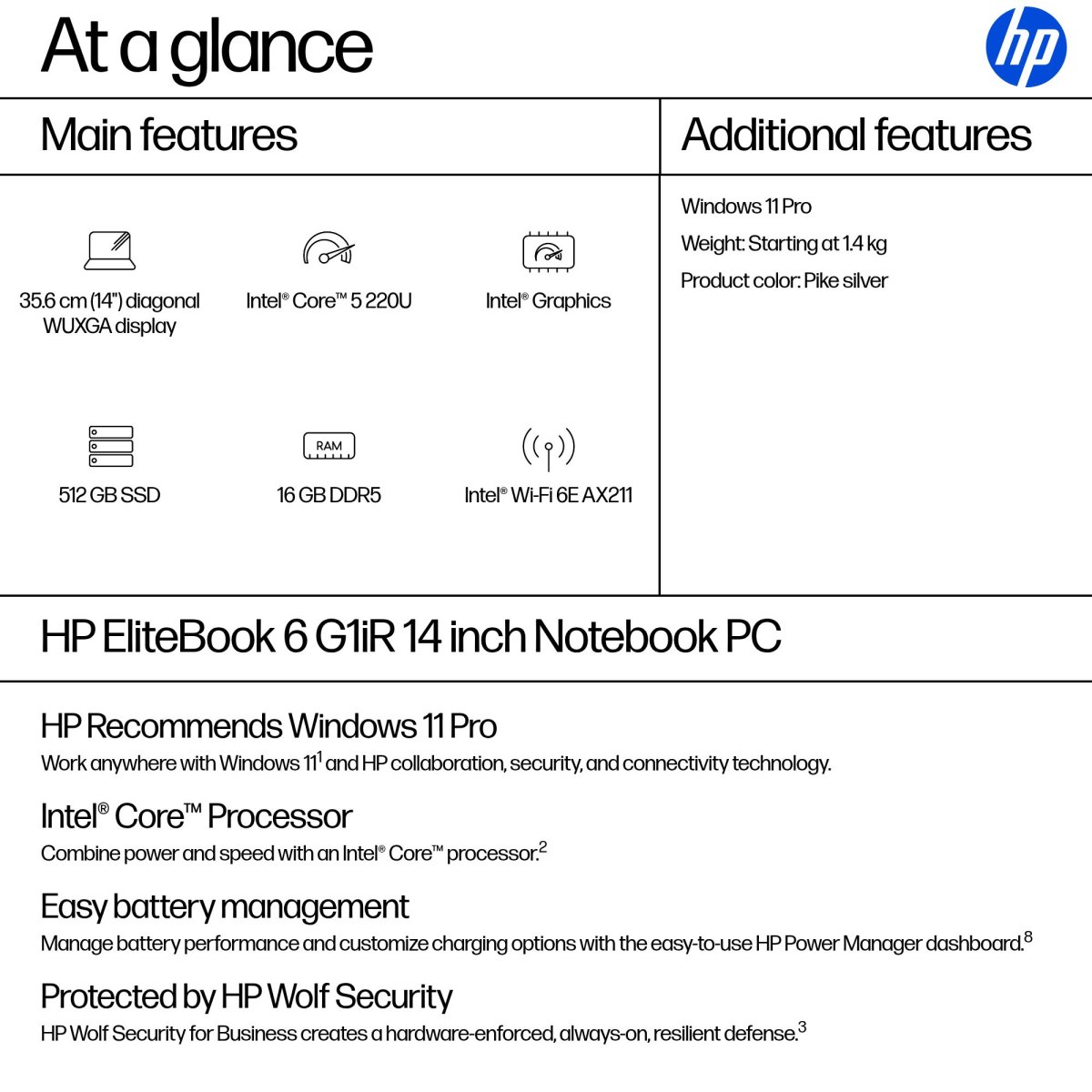Designed for seamless integration into existing IT infrastructures, the HP EliteBook 6 G1iR 14 inch Notebook PC is an economical, robust, and highly secure business PC. Equipped with essential tools that enable users to perform their tasks from virtually any location.