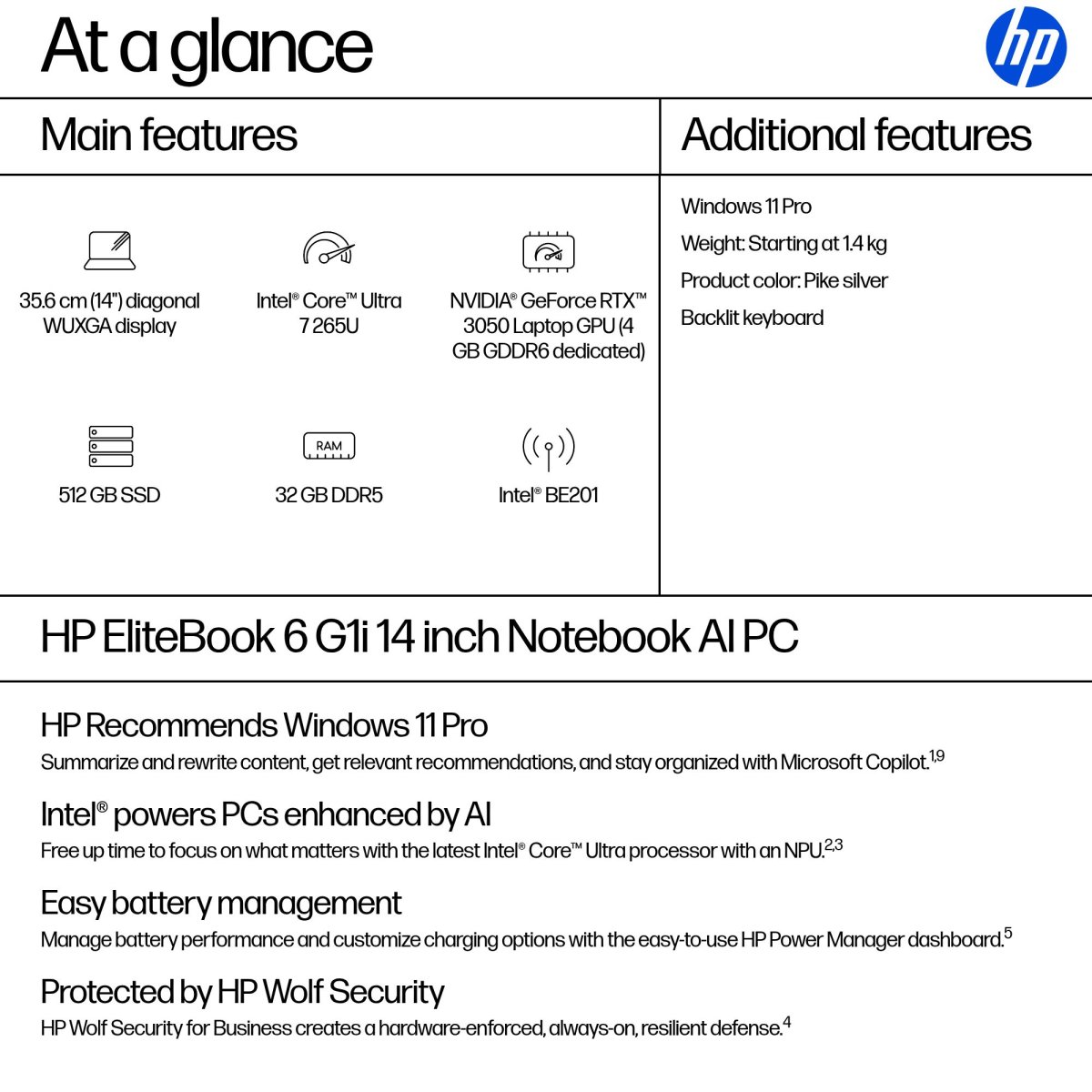 EliteBook 6 G1i 14 inch Notebook AI PC, 14″, Windows 11 Pro, Intel Core™ Ultra 7, 32GB RAM, 512GB SSD, WUXGA, Pike silver, AI PC