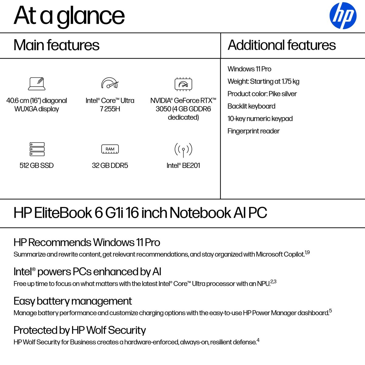 AI-based experiences and modern connectivity enhance user productivity. The HP EliteBook 6 G1i AI 16 inch PC offers an 11 TOPS NPU[3], enterprise-grade security and manageability in a highly configurable PC that meets the demanding needs of enterprise users.