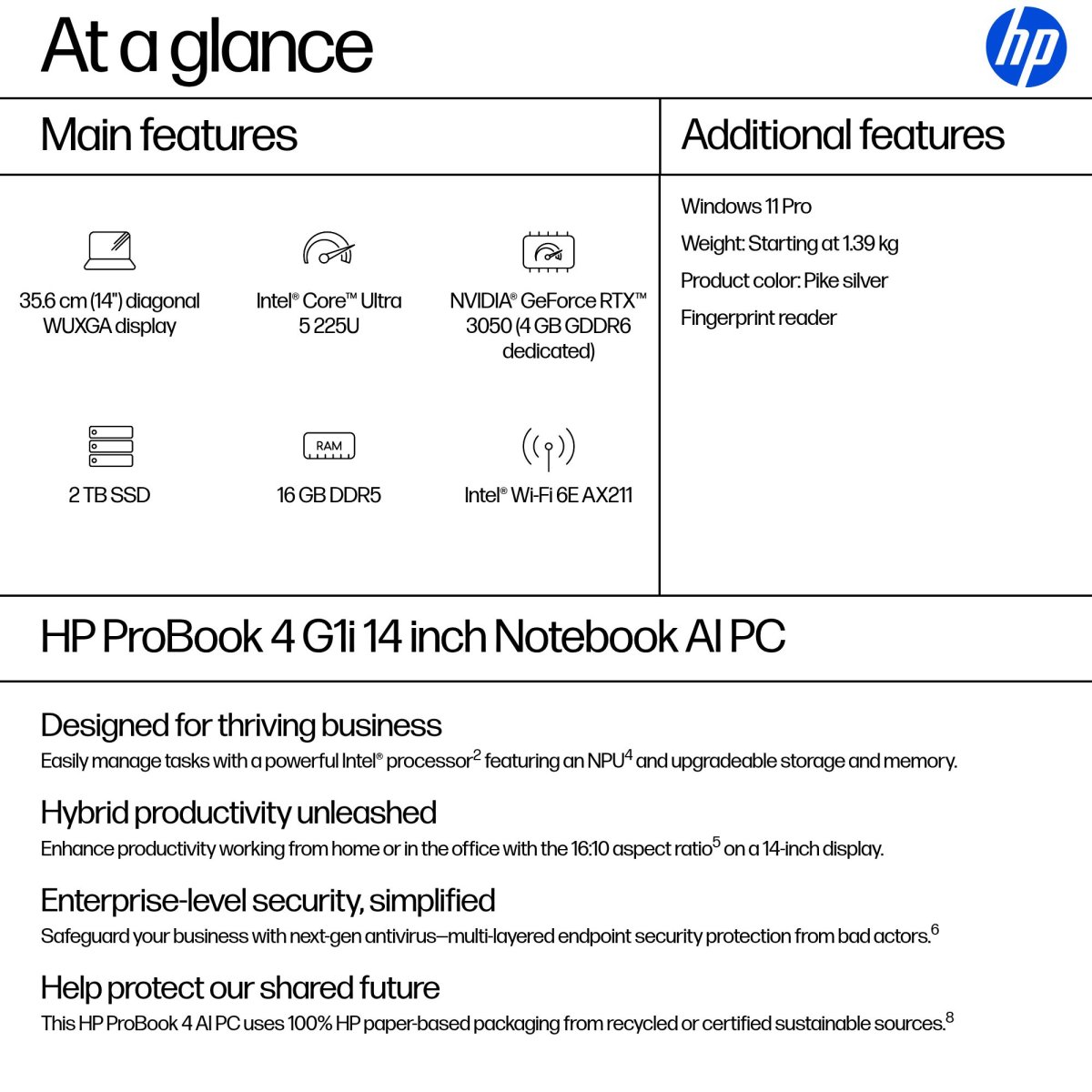 The HP ProBook 4 G1i 14-inch Notebook AI PC provides growing businesses with commercial-grade performance, multi-layered endpoint security[6], and durability in an easily upgradeable design. Powered by the latest Intel processor[2] with 11 TOPS NPU[4] and long battery life, this feature-rich PC is future-ready for long-term productivity and AI exploration.