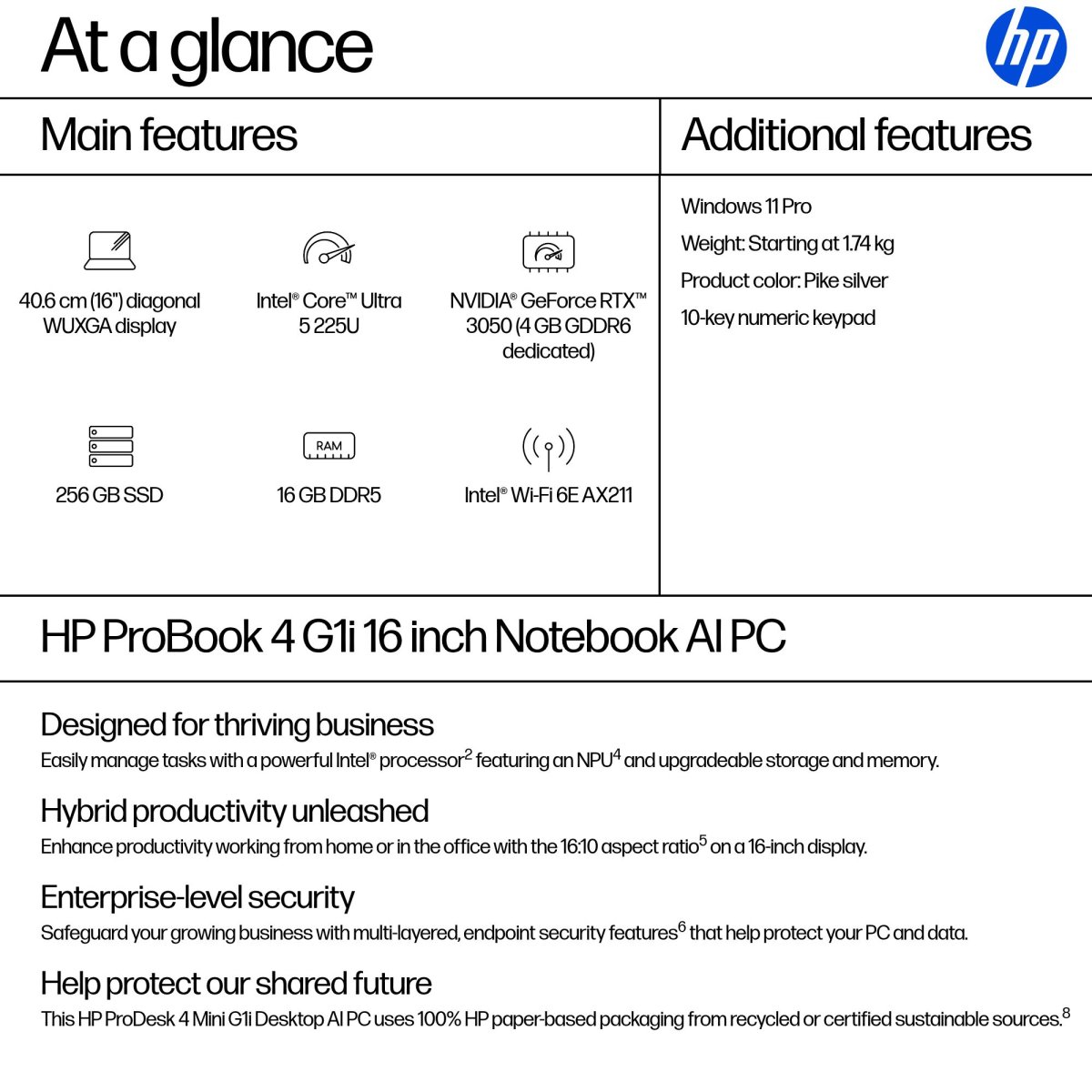 ProBook 4 G1i 16 inch Notebook AI PC, 16″, Windows 11 Pro, Intel Core™ Ultra 5, 16GB RAM, 256GB SSD, WUXGA, Pike silver, AI PC