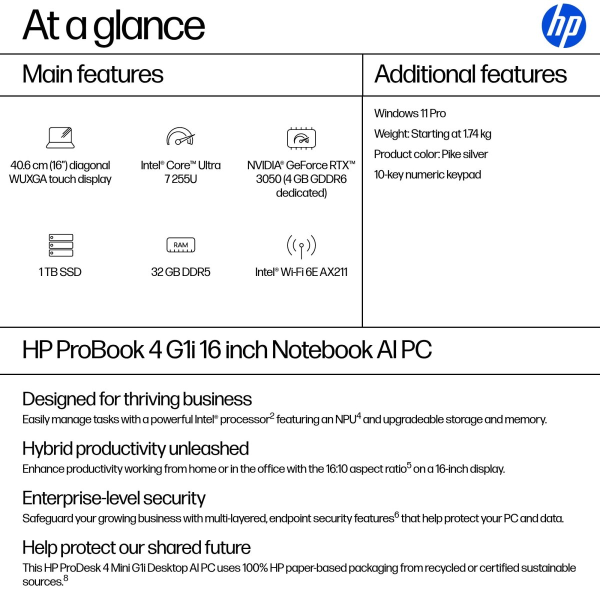 ProBook 4 G1i 16 inch Notebook AI PC, 16″, Touch screen, Windows 11 Pro, Intel Core™ Ultra 7, 32GB RAM, 1TB SSD, WUXGA, Pike silver, AI PC