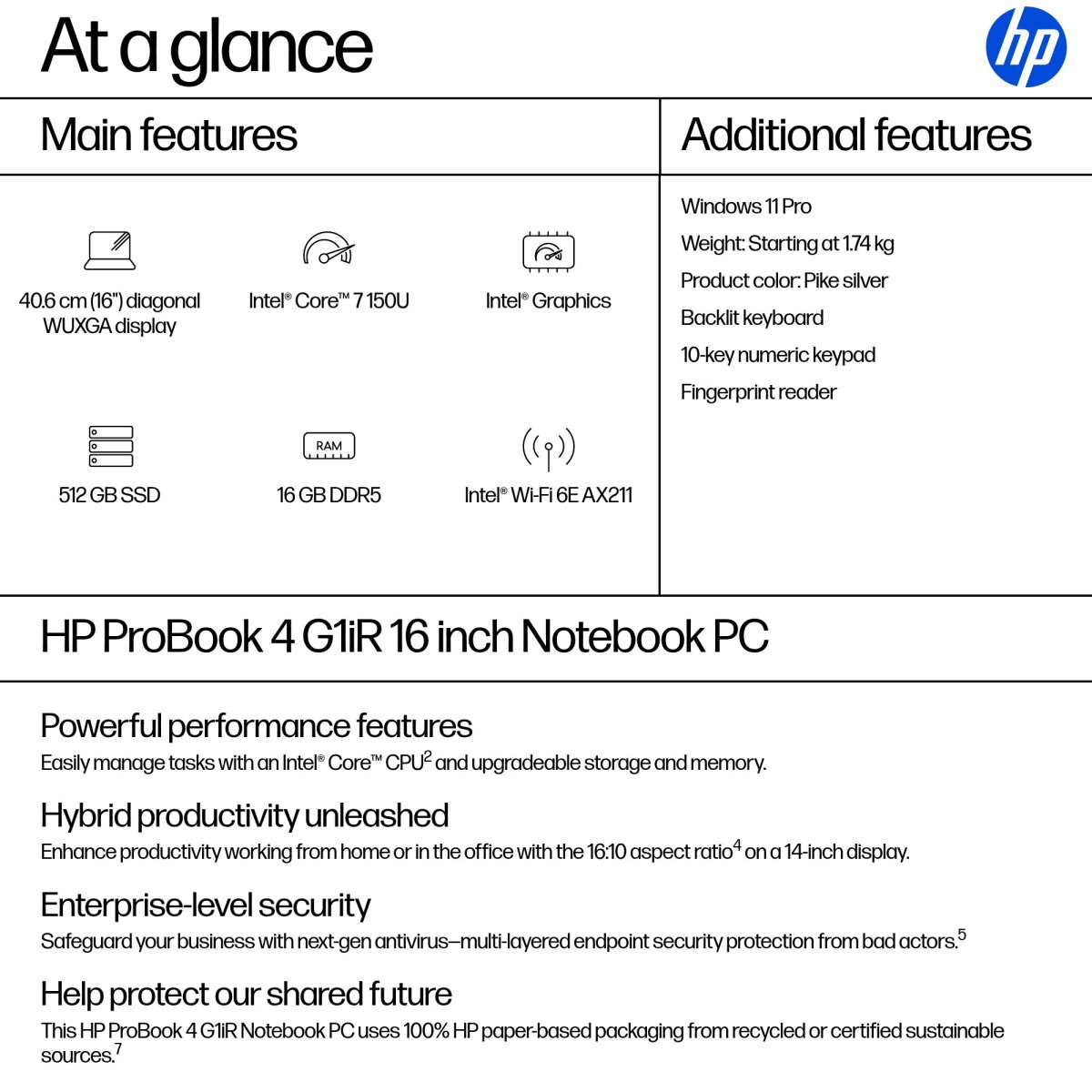 The HP ProBook 4 G1iR 16-inch Notebook PC provides growing businesses with commercial-grade performance, multi-layered endpoint security[5], and durability in an easily upgradeable design. Powered by the latest Intel processor[2] and long battery life, this feature-rich PC is future-ready for long-term productivity and helps enable hybrid work.