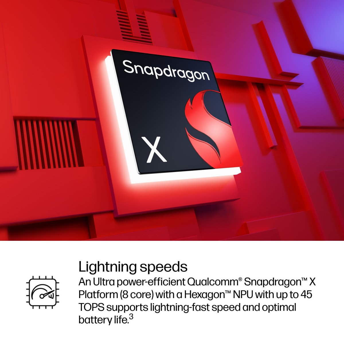 Unlock the lightning-fast speeds for all your productivity needs with the Snapdragon™ X Platform.[2]