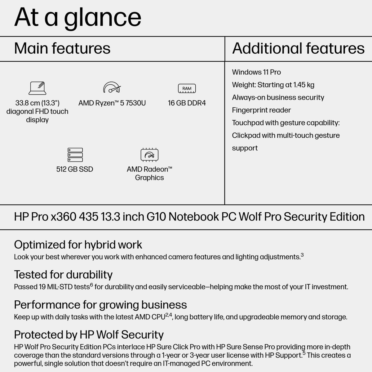 Drive business growth with the commercial-grade HP Pro x360 435 convertible touchscreen laptop. Focus on business priorities with a well-equipped device for hybrid work, that’s durably built and easily upgradeable for long-term performance.