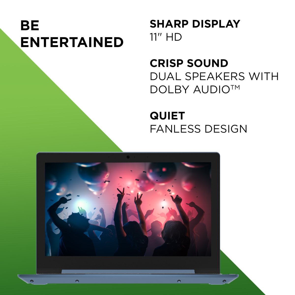 Dolby Audio™ delivers crystal-clear sound whether you’re watching a video or streaming music. With the built-in dual stereo speaker you’re sure to love what you hear on the IdeaPad 1 (11″).