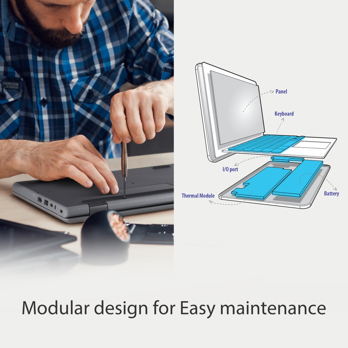 For easy on-site servicing and reduced downtime, ASUS BR1100C has a modular design that allows key components — such as the keyboard, battery, thermal module and I/O ports — to be replaced in minutes using simple tools. As well, the underside is secured attached using captive screws, eliminating worries about losing these little parts during repairs.