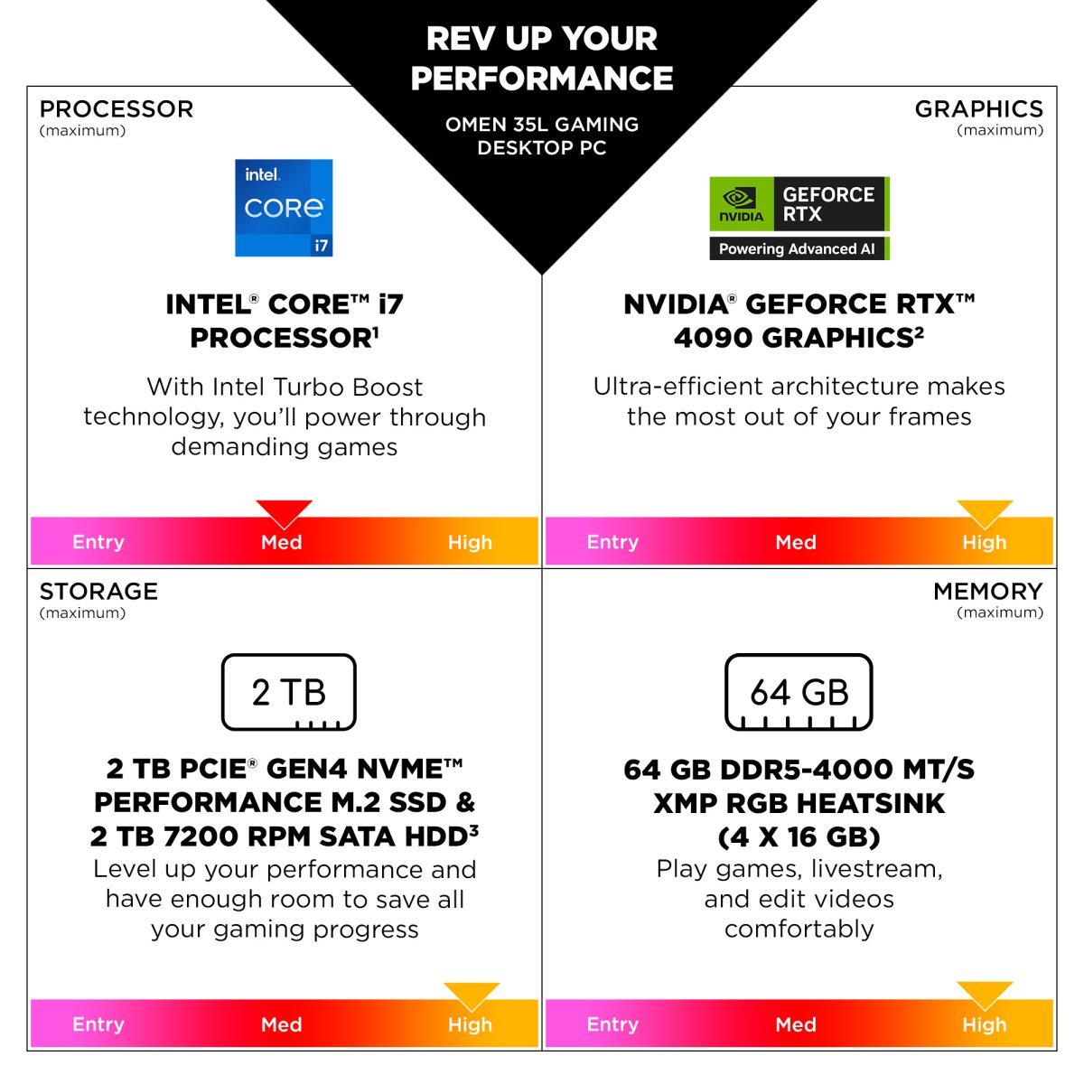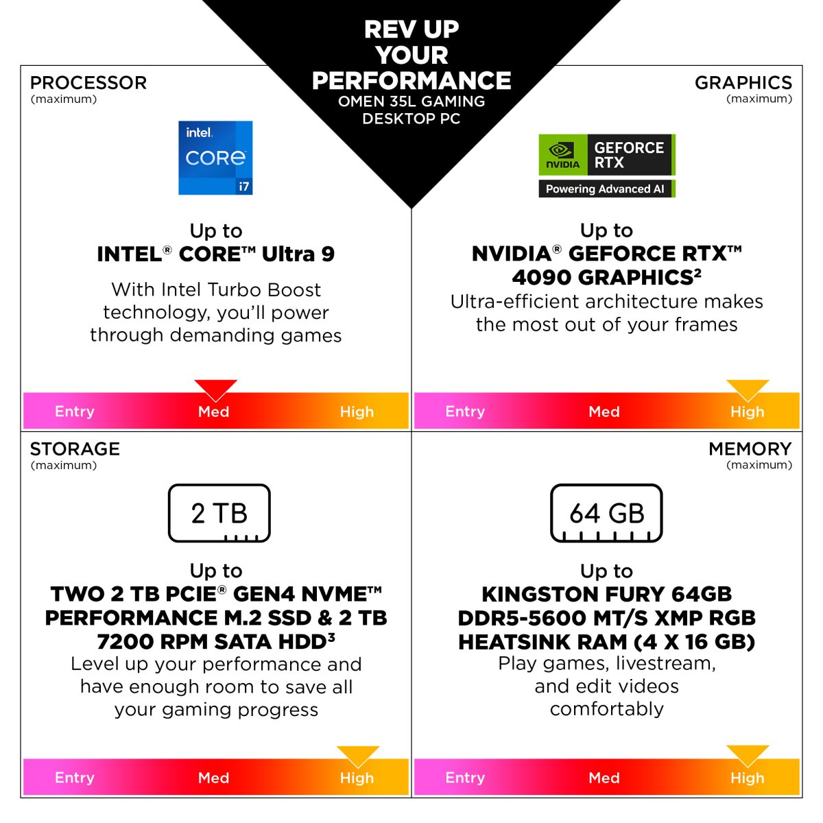 The OMEN 35L Gaming Desktop PC unlocks your performance potential. It features the latest Intel Core™ Processor[1] and advanced graphics, with OMEN branded components optimized for peak thermal capabilities and power. Designed for easy tool-less upgradability and personalization to suit your gaming needs.