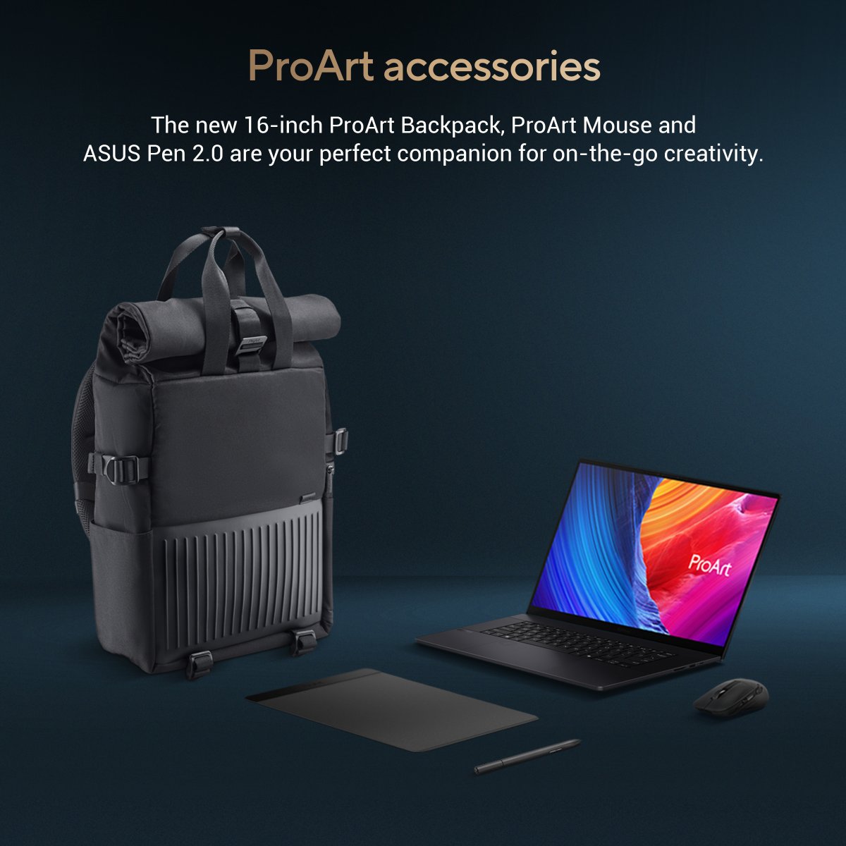 Versatile accessories, such as the new 16-inch ProArt Backpack*23 with thoughtful design which is the perfect companion for your on-the-go creativity. Plus, the ProArt mouse, ProArt mouse pad and ASUS pen 2.0, transform ProArt P16 into a powerful productivity tool.
