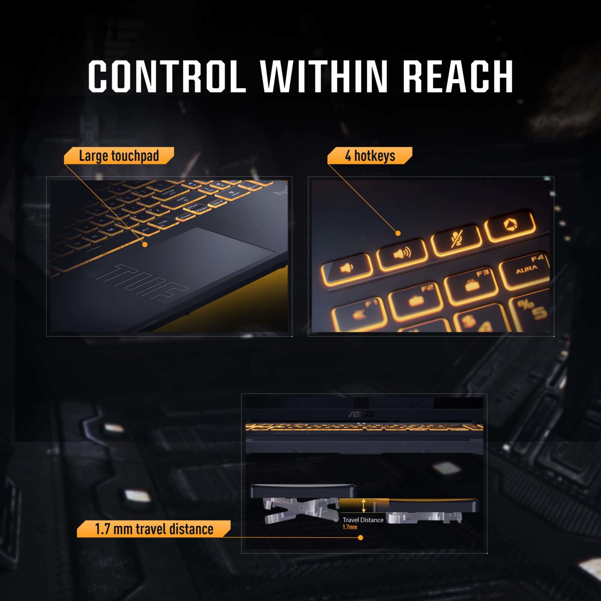 Dedicated hotkeys for volume controls, microphone mute, and a shortcut to Armoury Crate keep critical controls within reach when in game. A large touchpad allows for effortless scrolling, and the desktop-like keyboard features a 1.7mm key travel distance for comfortable typing and responsive controls when in game
