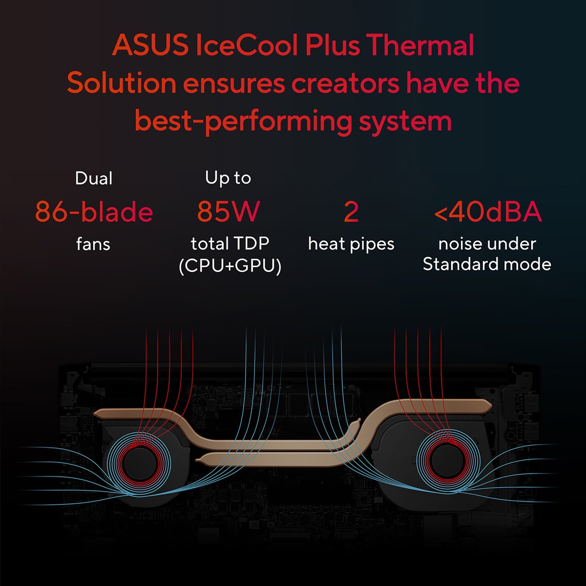 For always-cool performance, the ASUS IceCool Plus thermal technology in Vivobook Pro 15 OLED uses upgraded 8 mm and 6 mm heat pipes with dual fans that efficiently accelerate heat transfer. The 86-blade fan and impeller are made of side-chain liquid crystal epoxy polymer (LCP): the quiet, power-efficient 3D-curved blade design increases airflow by up to 16%. With less vibration, the Intel Core CPU and NVIDIA GPU can run comfortably at up to a blistering 85 W combined TDP in Performance mode — with no throttling!