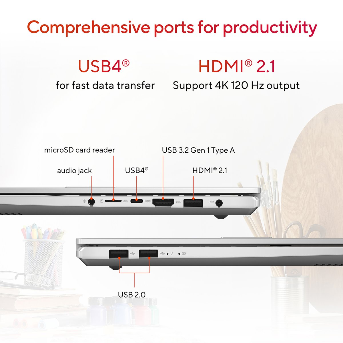 Vivobook Pro 15 OLED features a productivity-enhancing array of I/O ports, including USB 3.2 Gen 2 Type-C®, USB 3.2 Gen 1 Type-A, microSD card reader, HDMI® 1.4 and USB 2.0 ports — so you can easily connect all your latest peripherals, displays, or projectors to help you import, export, share or display your content faster and more conveniently than ever.