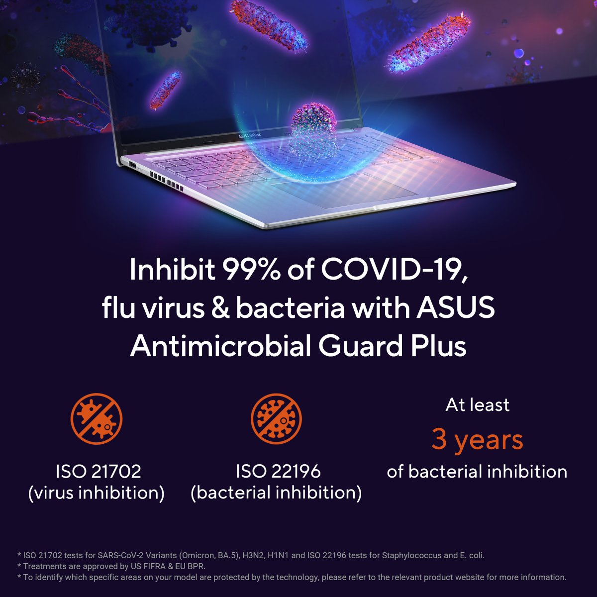 ASUS Antimicrobial Guard Plus is applied to frequently touched areas of your laptop to help keep it hygienic. This technology uses a denser treatment* that inhibits viruses and bacteria. And it is scientifically shown — using the ISO 21702*7 and 22196*8 standards — to inhibit virus and bacteria growth by more than 99% over a 24-hour period*9. Strains used for the tests include the SARS-CoV-2 (COVID-19), H3N2 (Influenza A) and the E. coli bacterium*4.