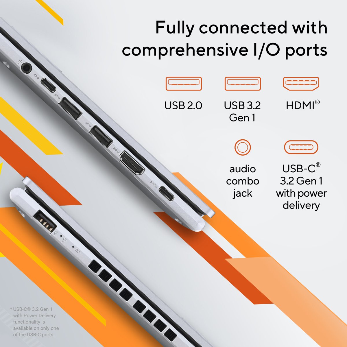 Vivobook 16 keeps you fully connected with its comprehensive I/O ports. There are an USB-C® 3.2 Gen 1 port with power delivery, two USB 3.2 Gen 1 Type-A ports, a USB 2.0 port, HDMI® output and an audio combo jack — so it’s easy to connect all your existing peripherals, displays and projectors.