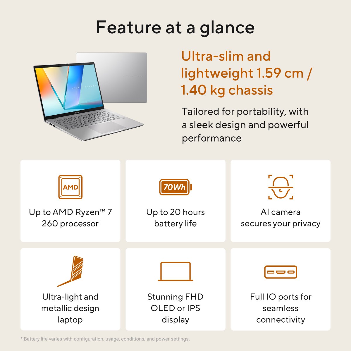 Experience effortless productivity with the ASUS Vivobook S14, your ideal companion for everyday life. Whether for work, study, or play, this laptop helps you power through any task, designed to be more productive, intelligent, and secure. Its sleek metallic design is both practical and stylish, with AMD Ryzen™ 5 220 processor and up to 20 hours of battery life* ensure all-day productivity. Enjoy stunning visuals on the vibrant 16:10 FHD OLED* or IPS display and immersive sound for better video calls and streaming. Built for a balanced lifestyle, the ASUS Vivobook S14 does more for you, giving you back time to enjoy life’s everyday moments.