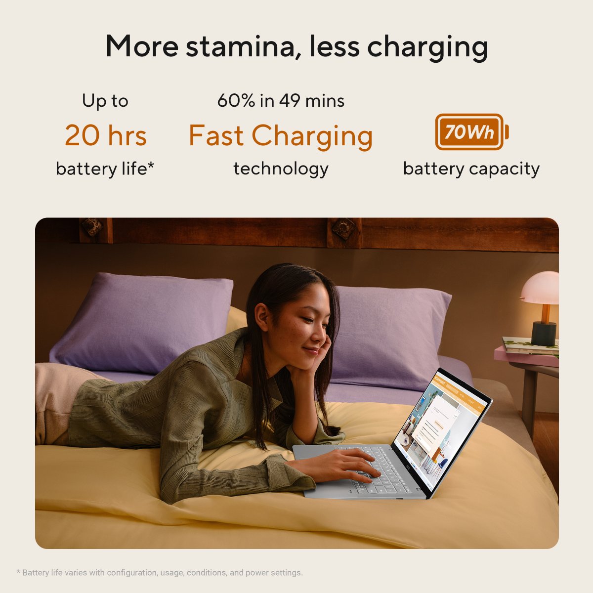 No need to worry about running out of battery with ASUS Vivobook S14! Its high-capacity 70WHhrs battery offers all-day stamina for seamless multitasking and entertainment, ensuring your laptop stays energized and ready for anything from dawn to dusk.