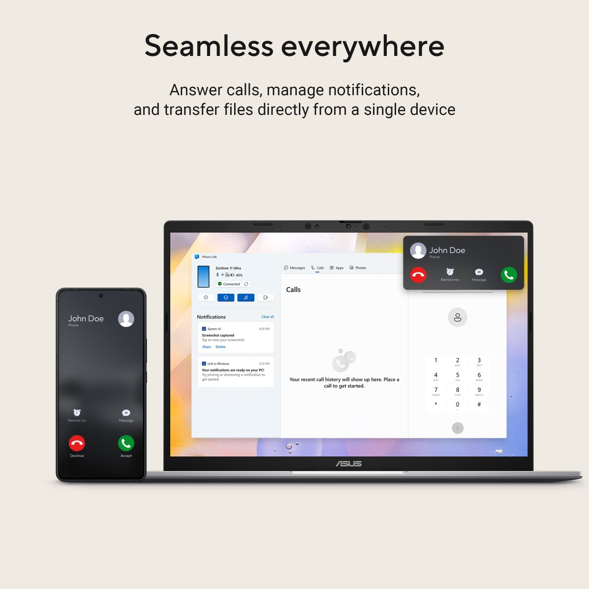 Experience an effortless life with seamless transitions across your laptop and phone for calls, texts, and file access via Microsoft Phone Link. This technology enhances cross-platform collaboration, integrating all your devices and peripherals into one unified system.