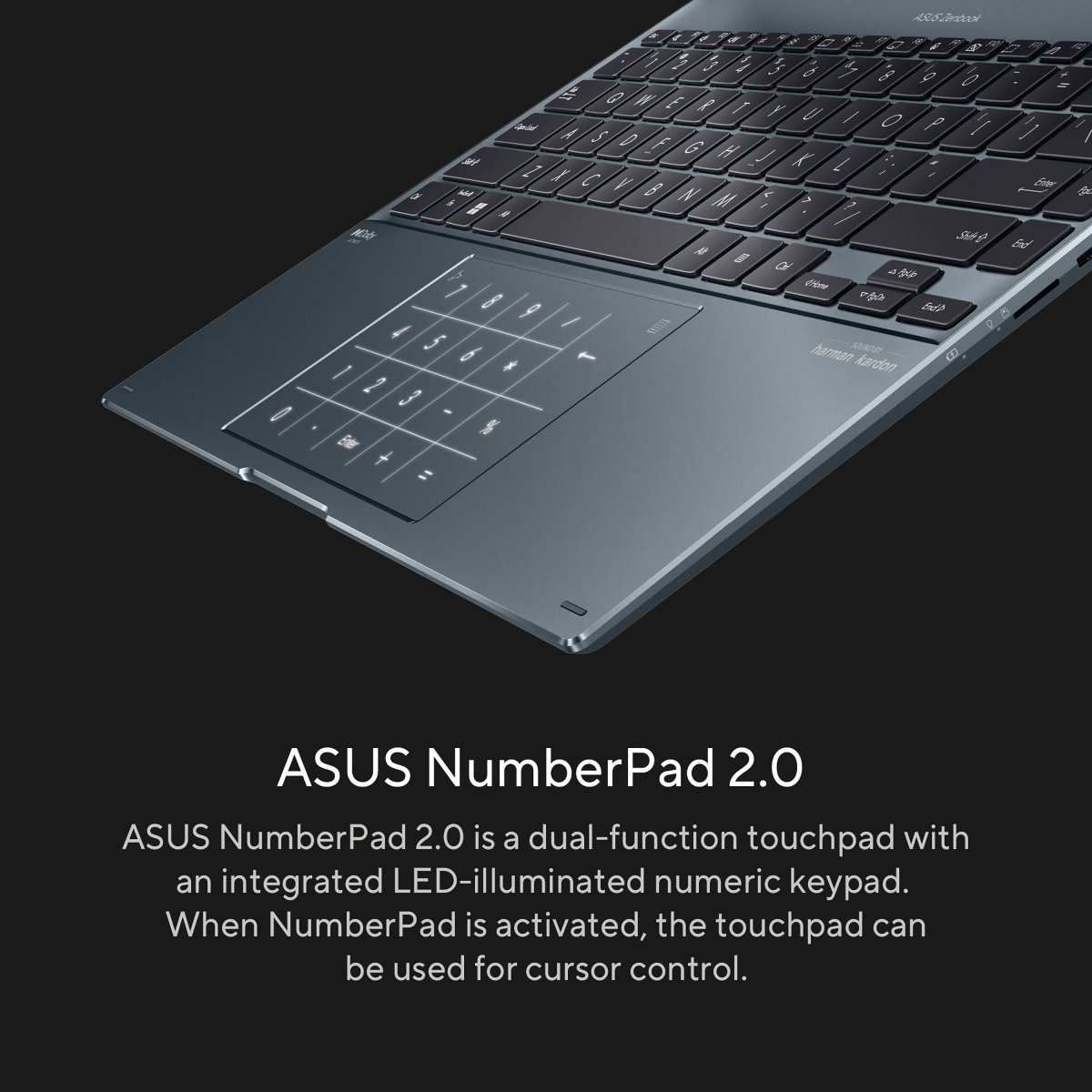 ASUS NumberPad gives you an intuitive way to input numbers for improved productivity, solving the long-time problem of the lack of a numeric keypad on compact devices. The improved NumberPad 2.0 is even more convenient: tap on the top-right NumberPad icon for one second to switch the function on or off, and tap on the top-left icon to choose one of two brightness levels. You can also swipe from the top-left icon in any direction to activate the Windows Calculator app on the display for faster access.