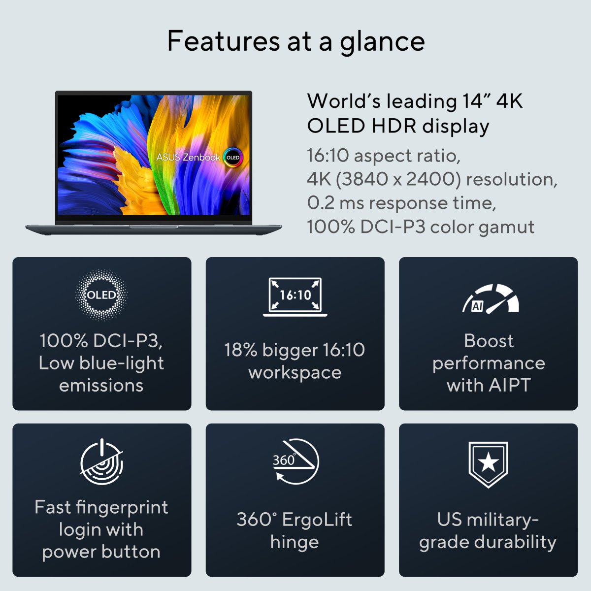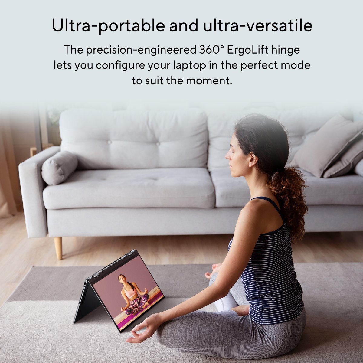 Whatever you’re doing, wherever you are, Zenbook 14 Flip OLED’s precision-engineered 360° ErgoLift hinge makes it ultra-versatile and ultra-portable. Use it in laptop mode, tent mode, stand mode, tablet mode — or anything in between.