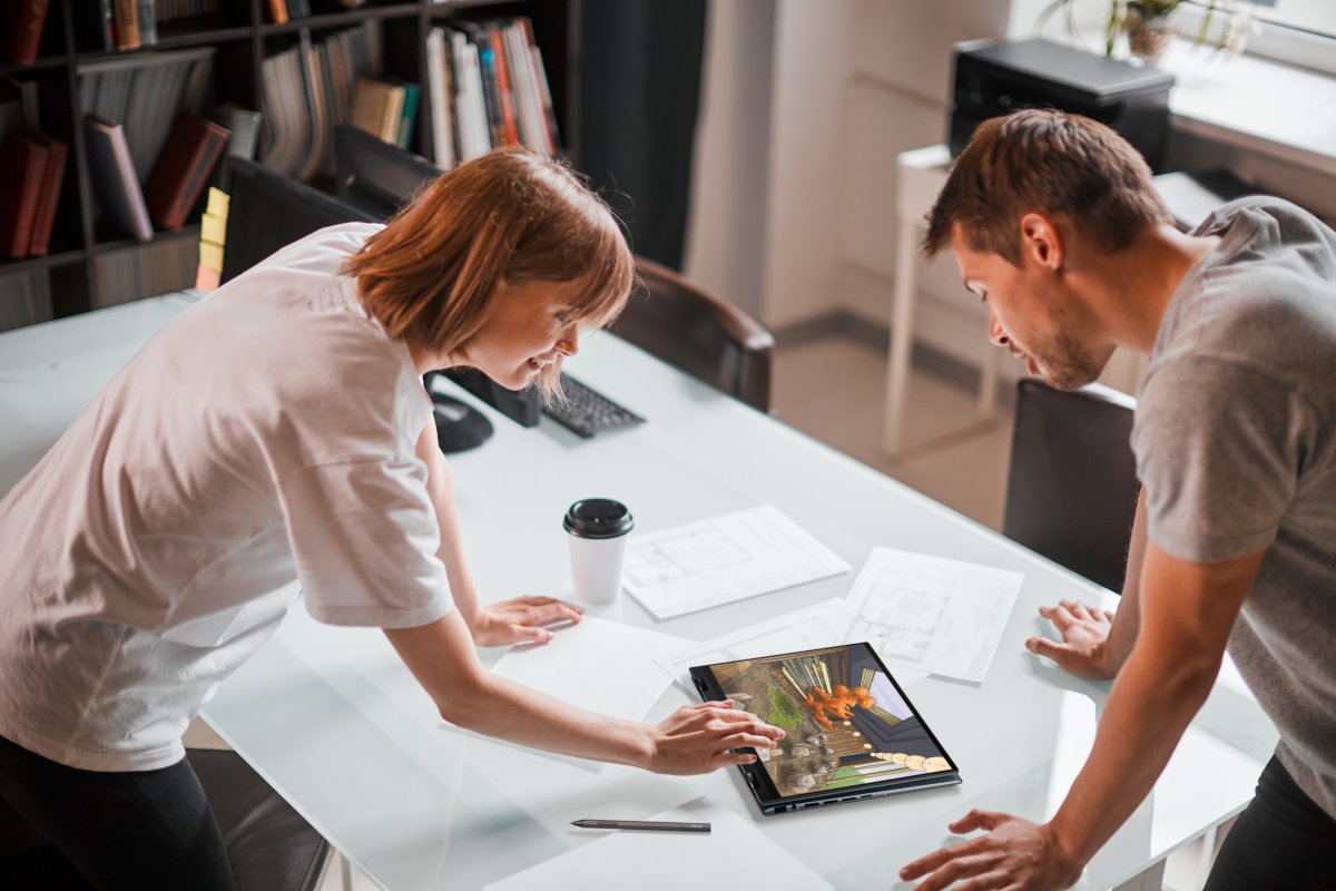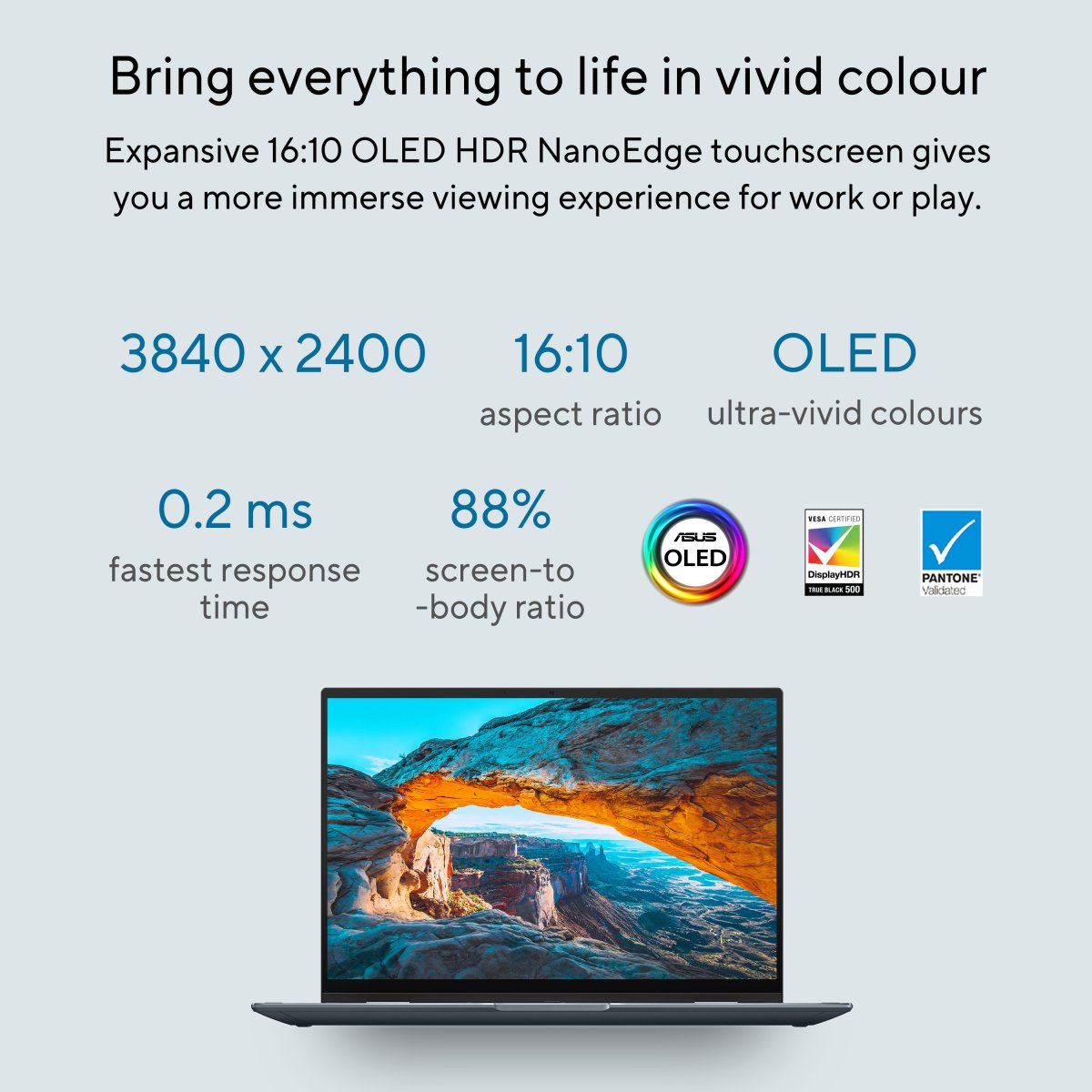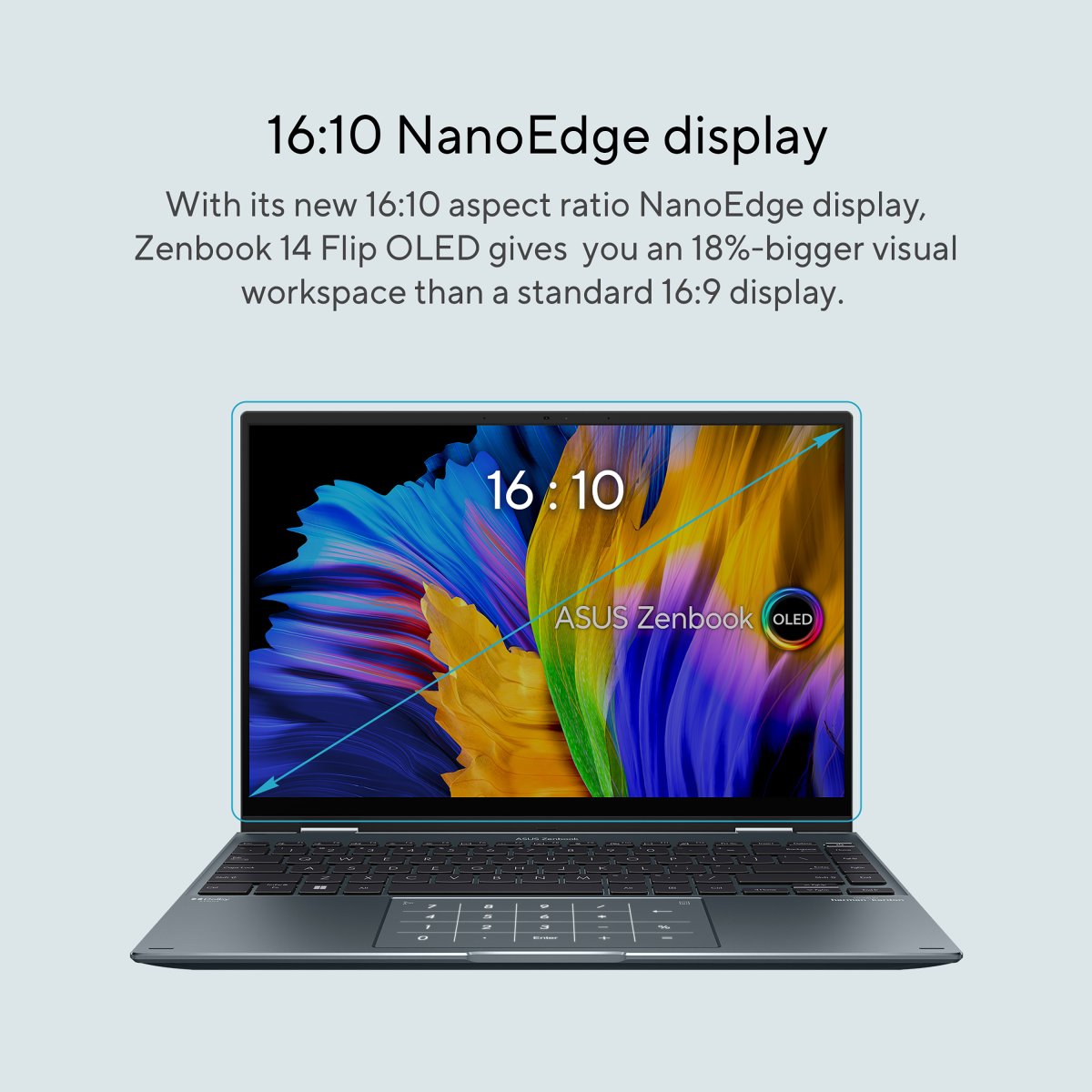 With its new 16:10 aspect ratio NanoEdge display, Zenbook 14 Flip OLED gives you an 18%-bigger visual workspace than a standard 16:9 display. The taller screen lets you see more of a website or document without having to scroll up or down. It’s perfect for reading, writing or coding.