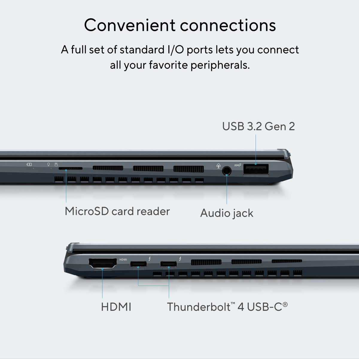 Zenbook 14 Flip OLED is packed with all the I/O ports you need for easy connectivity to your devices and peripherals. The latest ultrafast Thunderbolt™ 4 USB-C® ports support fast charging, 4K UHD external displays and up to 40 Gbps data transfers, and there’s also an HDMI port and a USB 3.2 Gen 2 Type-A port alongside a microSD card reader. Communications and audio I/O are taken care of by the convenient audio combo jack.