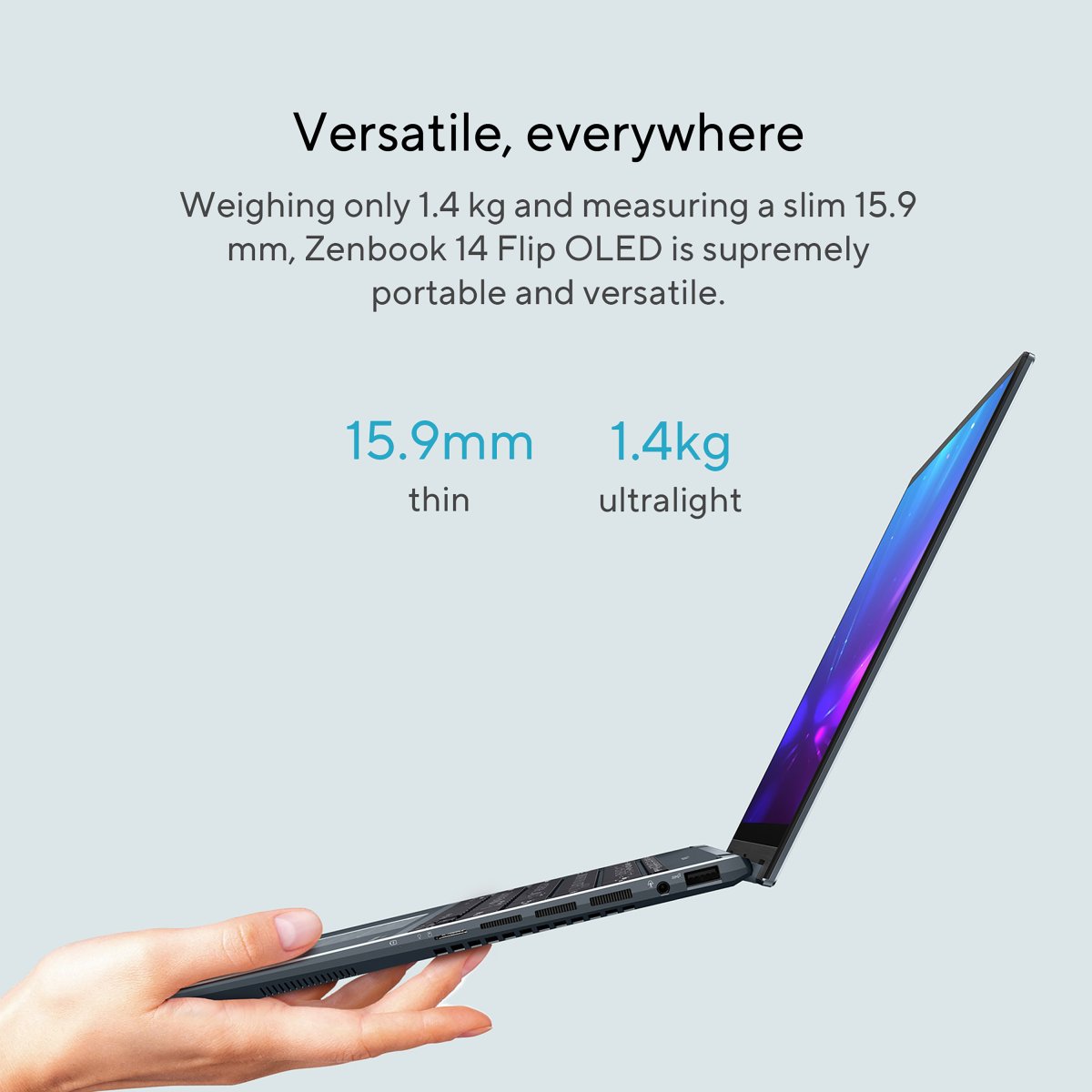 Weighing only 1.4 kg and measuring a slim 15.9 mm, Zenbook 14 Flip OLED is supremely portable and versatile. And its comprehensive I/O ports mean you can connect to anything you want, wherever you are.